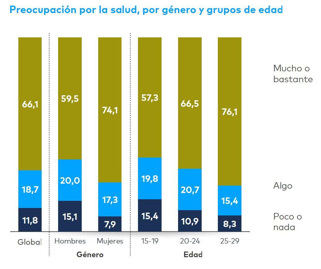 Tener una buena salud es lo que más valoran en esta etapa de la vida (60.2%), por encima de ganar dinero (46.3%) o tener buenas relaciones familiares (35,31%). Las mujeres le otorgan mayor importancia y, por grupos de edad, las y los jóvenes de la franja 25-29 años.
