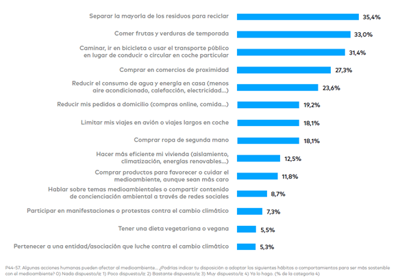 Sin embargo, por ahora, ninguno de los hábitos relacionados con el medioambiente, como separar los residuos, comprar en comercios de proximidad, reducir el consumo energético o consumir alimentos de temporada, supera el 35%, por lo que es posible apuntar queestas rutinas no están aún integradas de forma generalizada entre los jóvenes.