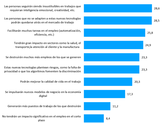 Las percepciones con respecto al impacto de la IA en el ámbito laboral están muy divididas: el 28,6% confía en que los seres humanos serán irremplazables, frente a un 28,5% que considera que las personas que no se adapten a estas nuevas tecnologías podrán quedarse atrás en el mercado laboral