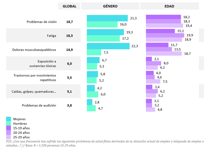A estos malestares emocionales y de salud mental se suman los físicos: casi la mitad de las personas jóvenes (48,3%) sufre dolores musculoesqueléticos de vez en cuando, junto con fatiga y falta de descanso (40,2%). Las consecuencias son especialmente notables en quienes compaginan trabajo y estudios, así como en el grupo de 25 a 29 años, y especialmente persistente en mujeres (el 22,3% de ellas sufren “continuamente” estas dolencias, mientras que sólo las sufren “continuamente” el 7,5% de los chicos).